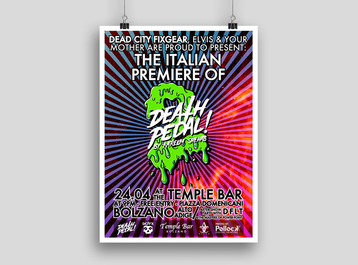 Poster design and event management for the italian premiere in Bolzano for the FGFS DVD "Death Pedal 2" by Kareem Shehab.